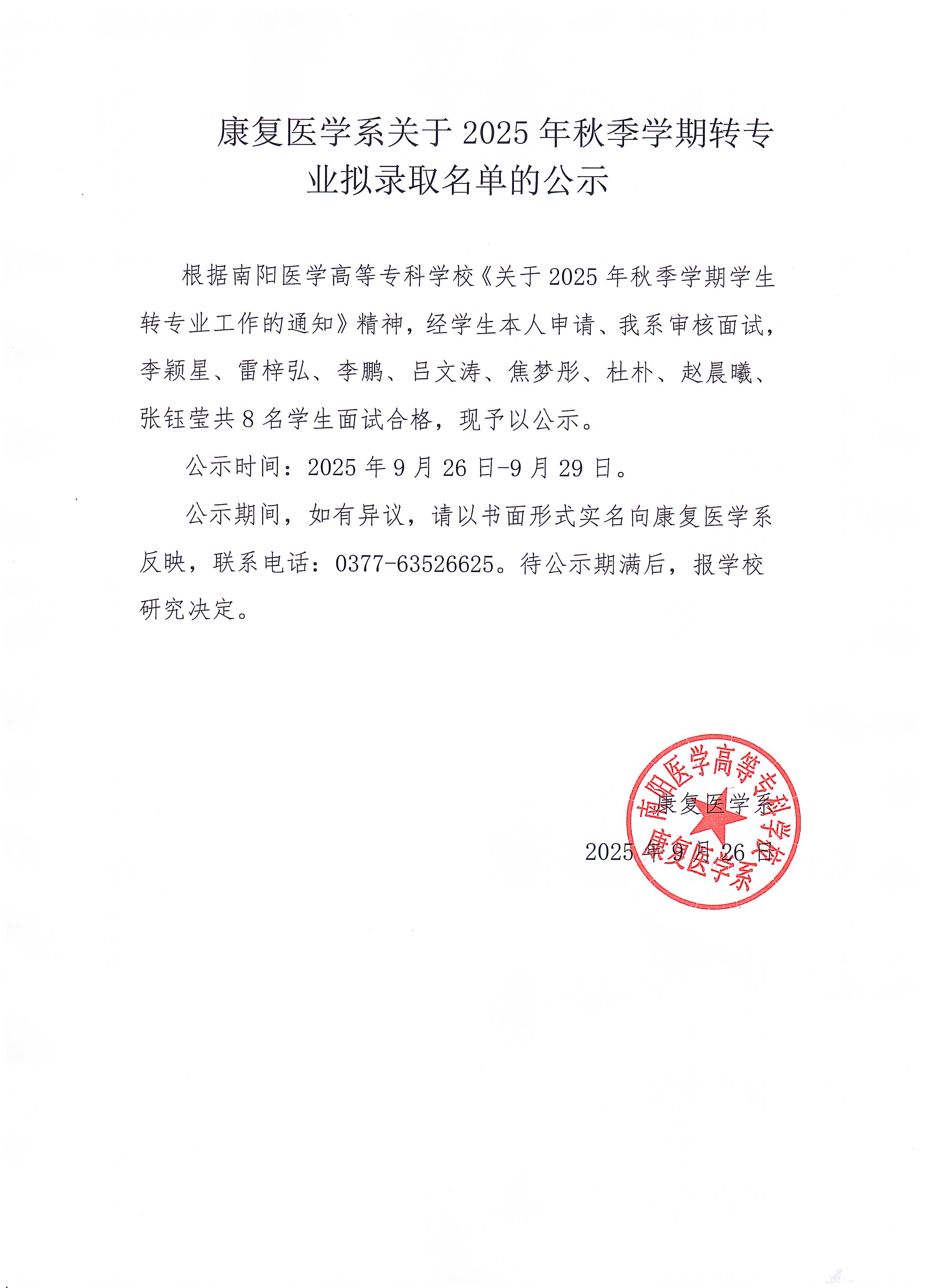 康复医学系关于2025年秋季学期转专业拟录取名单的公示
