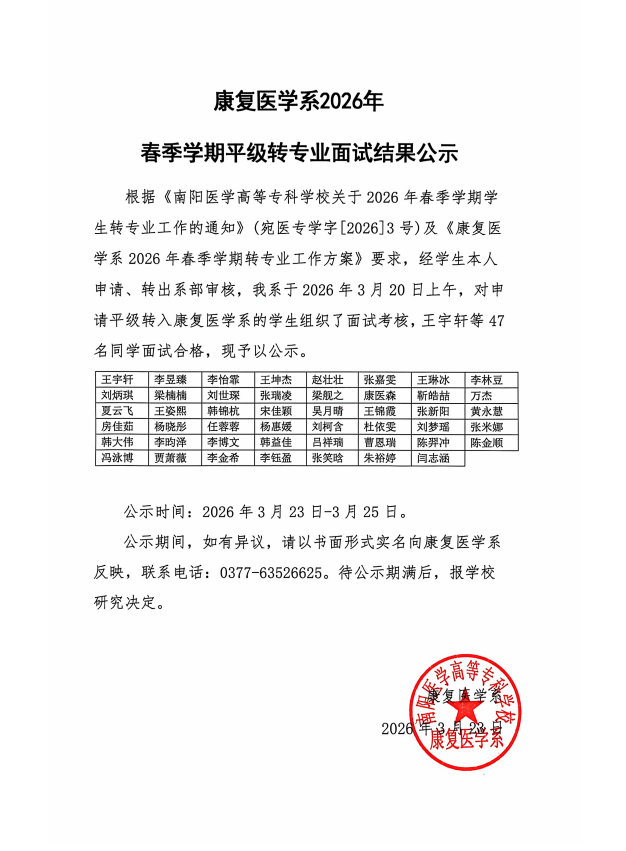 康复医学系2026年春季学期平级转专业面试结果公示