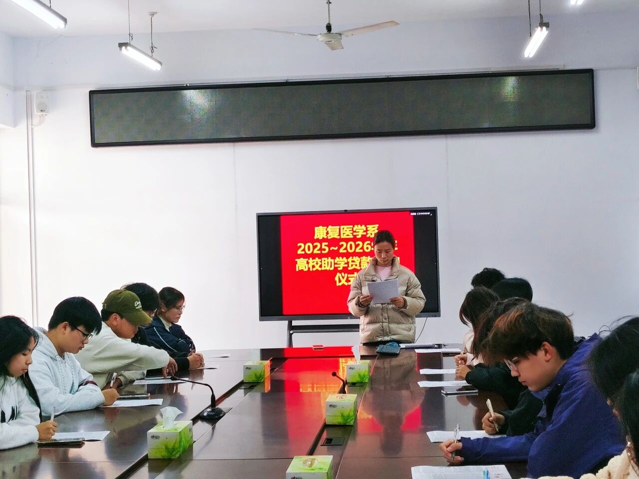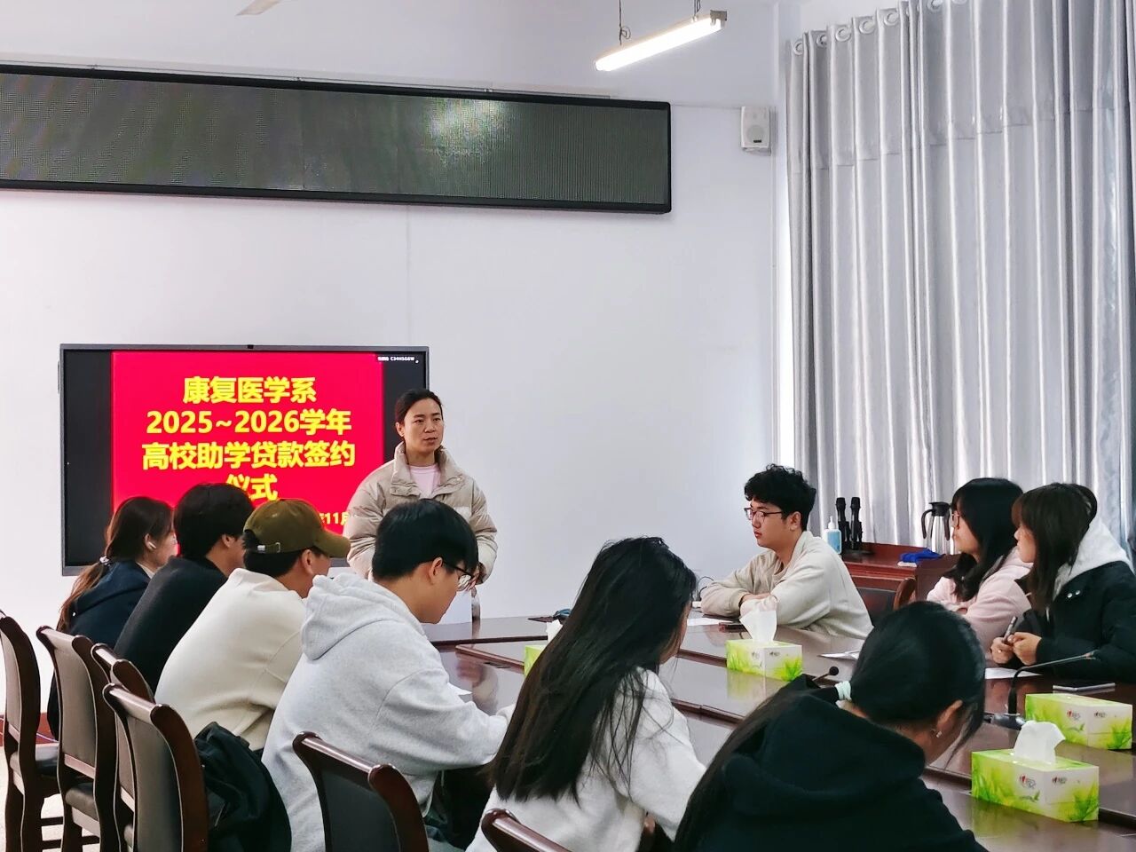 11月6日,康复医学系在1号教学楼4楼会议室举行2025-2026学年校园地国家助学贷款合同签订仪式。本次活动由系资助专干桂小玲老师组织,2025级全体助学贷款申请学生参与。